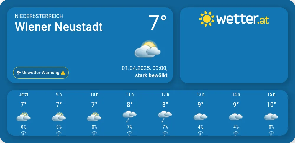 Für eine detailliertere Prognose sehen Sie sich auch das 14-Tage-Wetter für Wiener Neustadt an oder unser Wetter für jede Stunde wenn es noch genauer sein soll.